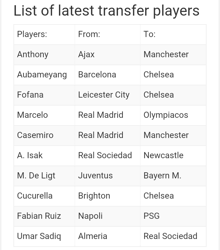 Raheem Sterling โ Chelsea Kalidou Koulibaly โ Chelsea Gabriel Jesus โ Arsenal Erling Haaland โ Man City Darwin Nunez โ Liverpool Romelu Lukaku โ Inter Milan (loan) Cristiano Ronaldo โ Manchester United Lionel Messi โ PSG Martin Odegaard โ Arsenal Emi Buendia โ Aston Villa Tammy Abraham โ Roma Raphael Varane โ Manchester United Dayot Upamecano โ Bayern Munich Ben White โ Arsenal Achraf Hakimi โ PSG Jadon Sancho โ Manchester United Jack Grealish โ Manchester City and so onโฆ